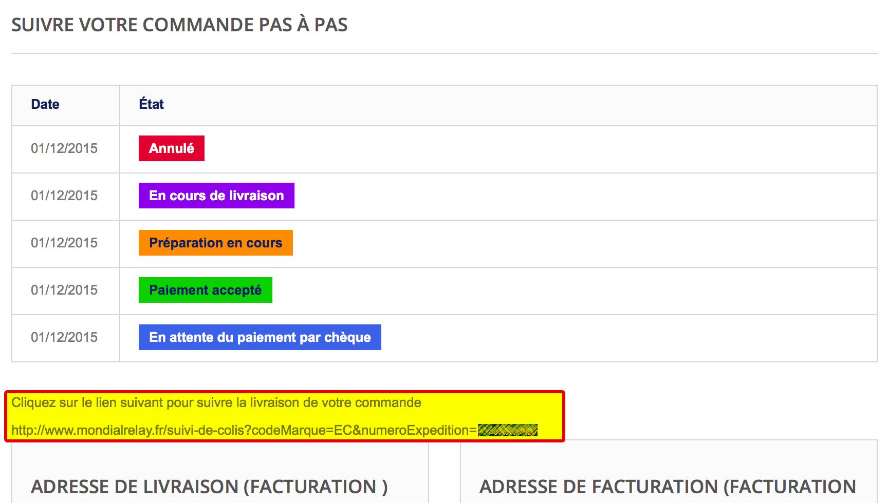 Vous trouverez le lien de suivi sous le tableau d'avancement du statut de la commande, juste avant les blocs des adresses de facturation et livraison.